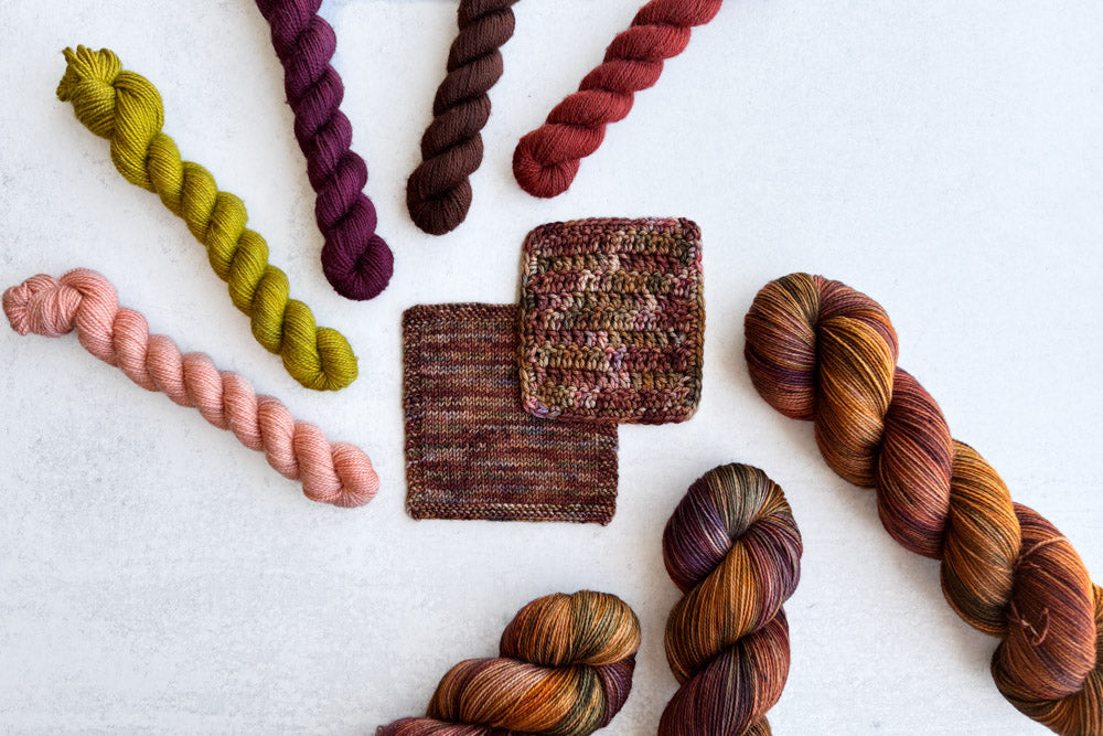 Maroon and pumpkin topped with subtle green and purple pours make Cider the coziest skein around.