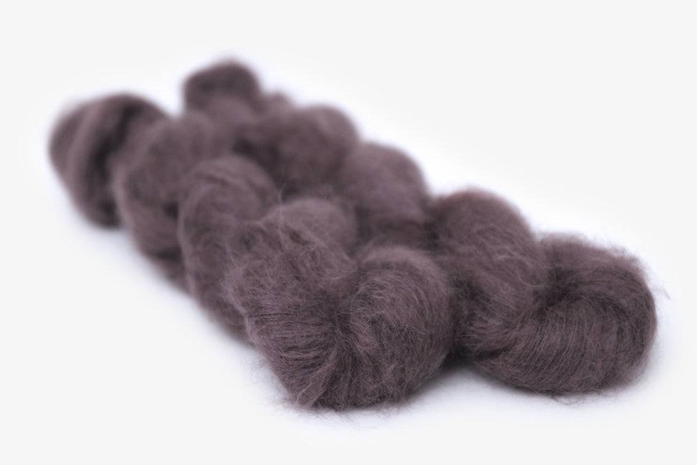 Our Concord colorway is a muted dark purple yarn that is both moody and mysterious. Spun from the softest mohair, this luxurious fiber glows, adding elegance, halo and warmth to every knit and crochet project.