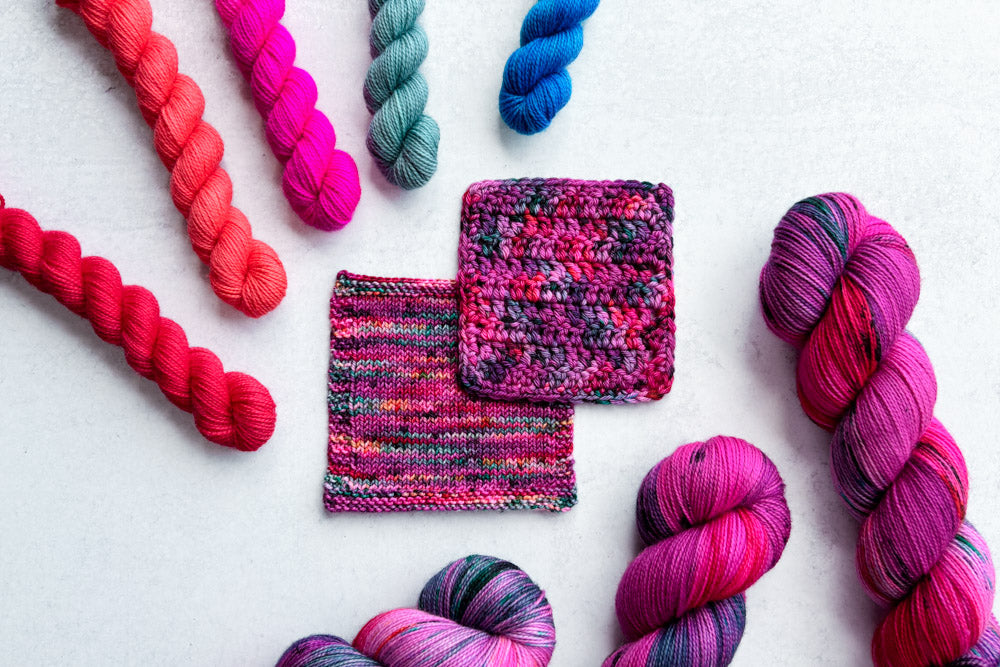 Knit swatch shown in Merino Sock, crochet swatch shown in Phyllis DK. Swatch will vary depending on base.
