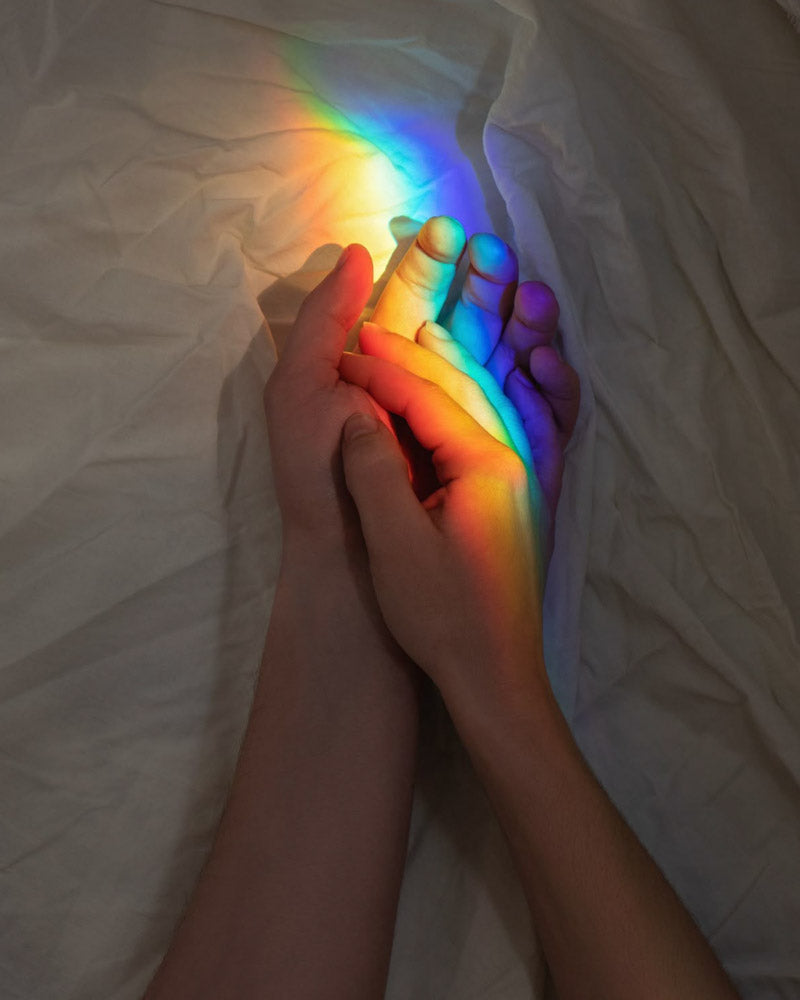 Feel the love with this tonal skein's palette of raspberry, tangerine, sunny gold, deep sky blue, and iris!
