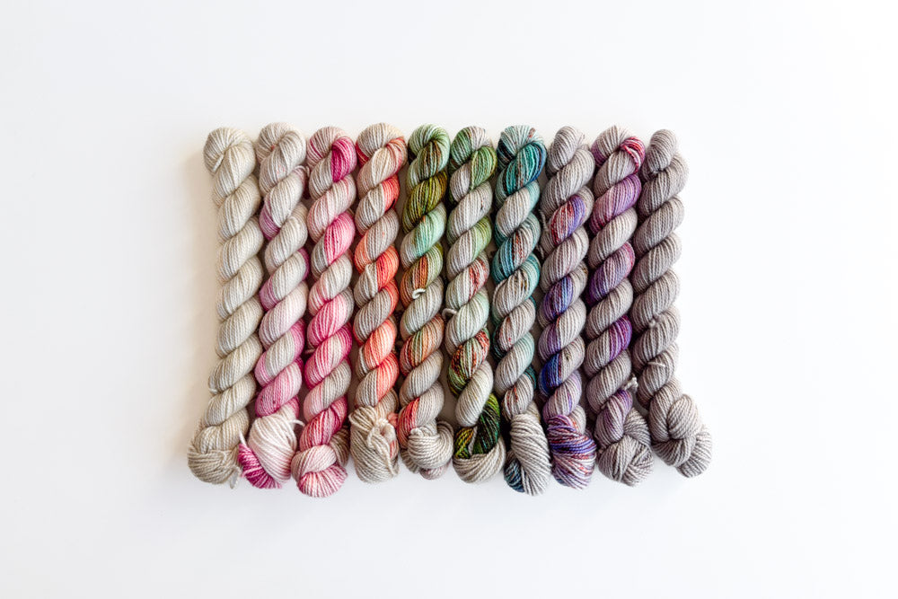 This set is full of heart! Alabaster fades smoothly into a warm grey with prismatic pops of berry, tangerine, spring green, sky blue, and iris along the way!
