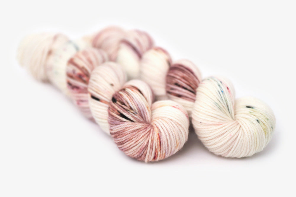 An airy cream skein with gentle mauve and violet pours, plus rustic maroon, earthy green, and ochre speckles.