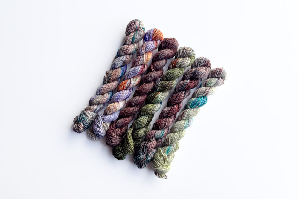 Snag a one-of-a-kind mini grab bundle featuring our colorway, Pagosa! Each grab bundle contains 6 (20g) mini skeins in Merino or Phyllis Sock. The mini breakdown for each bundle is as follows: 1 semisolid mini, 2 tonal minis and 3 speckled minis. All minis coordinate with our featured colorway of the month.