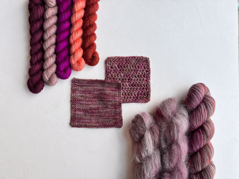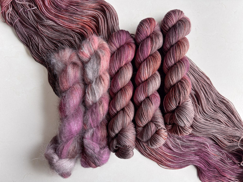 Colorway shown in the following order: Mohair, Suri, Phyllis Sock, Merino Sock, DK.